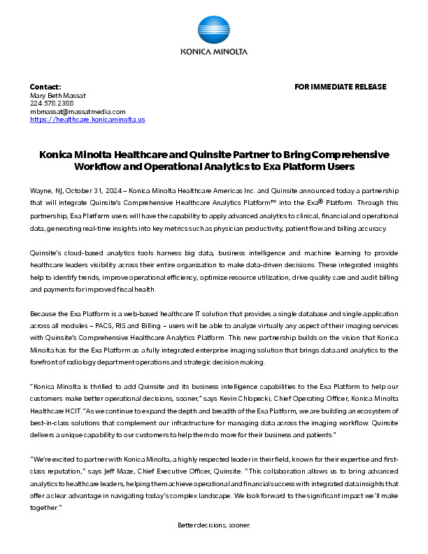 Konica Minolta Healthcare and Quinsite Partner to Bring Comprehensive Workflow and Operational Analytics to Exa Platform Users Resource Type: Press Release Related Products: Exa PACS Last Updated: Thu, Oct 31 2024 Download